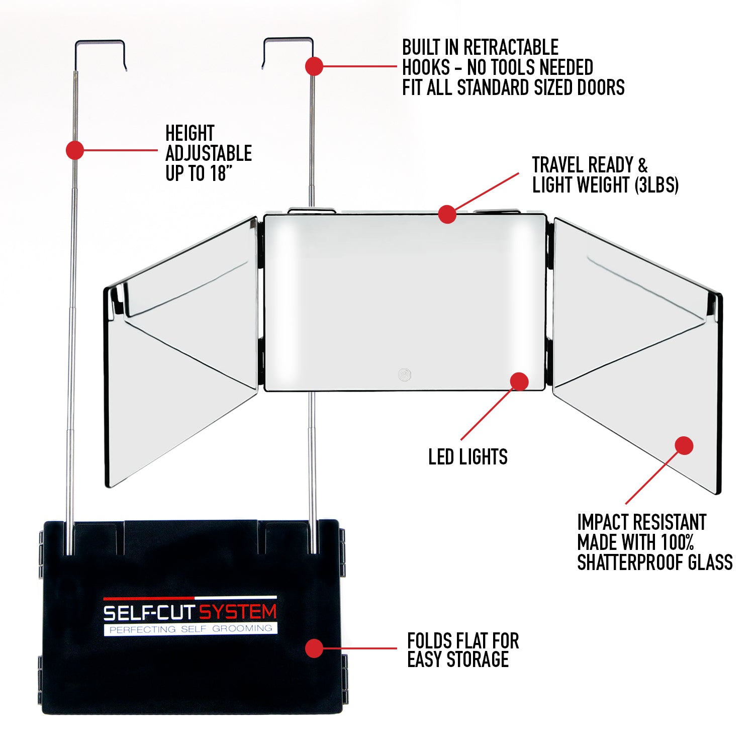 The Self-Cut System 3.0 Travel LED is a three-way mirror system equipped with built-in high-quality LED lights. It allows users to see every angle of their head, facilitating precise self-haircuts. The system is designed for portability and convenience.